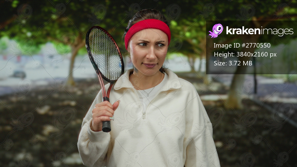 Woman holding tennis racket in park with questioning expression, wearing red headband and white jacket, surrounded by lush greenery, capturing a candid outdoor moment. - Kraken Images