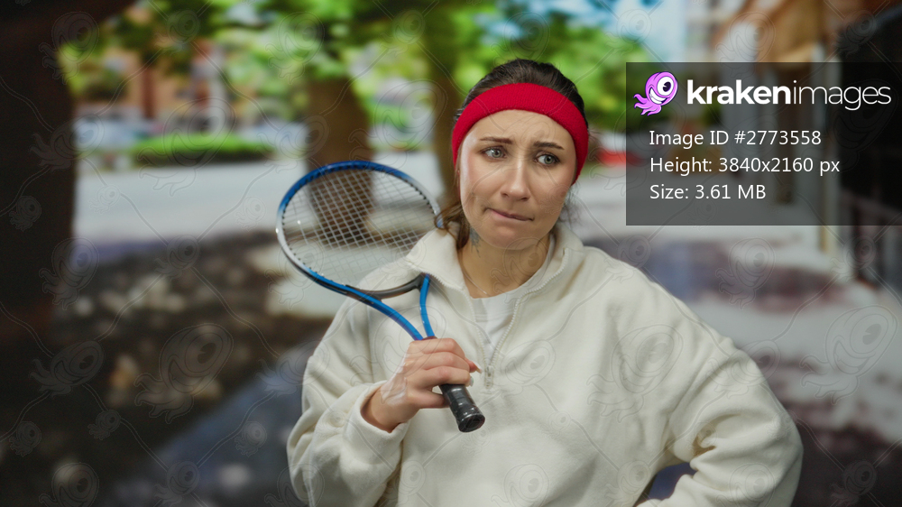 Woman holding tennis racket looking thoughtful in a city street background, wearing a red headband and white sweatshirt, portraying outdoor tennis sport and expression. - Kraken Images
