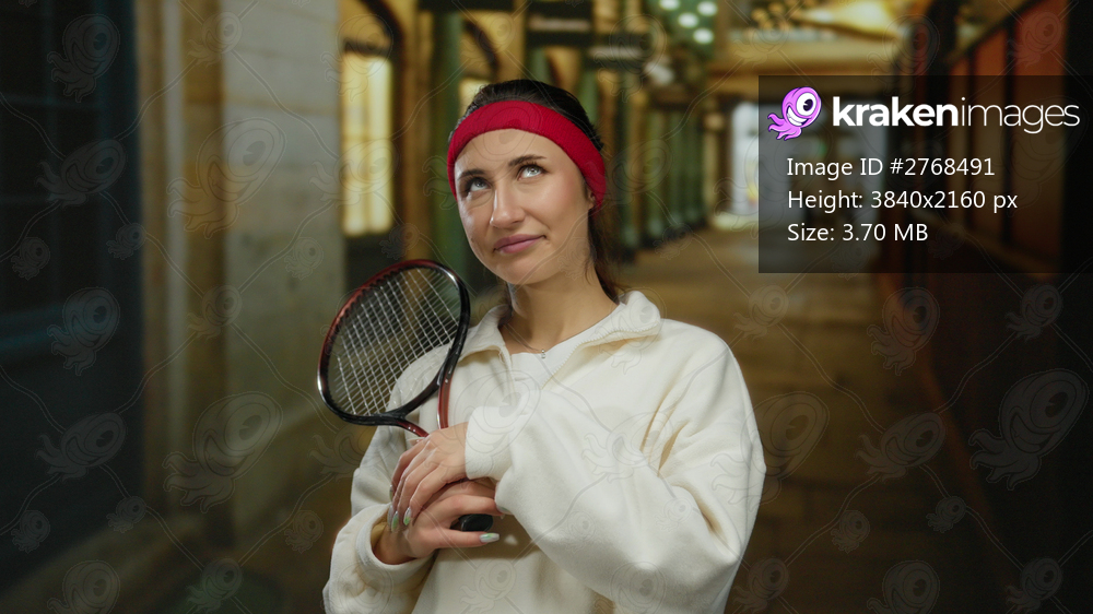Woman holding tennis racket outdoors on city street wearing a red headband and white jacket with a confused expression suggesting curiosity in urban surroundings. - Kraken Images