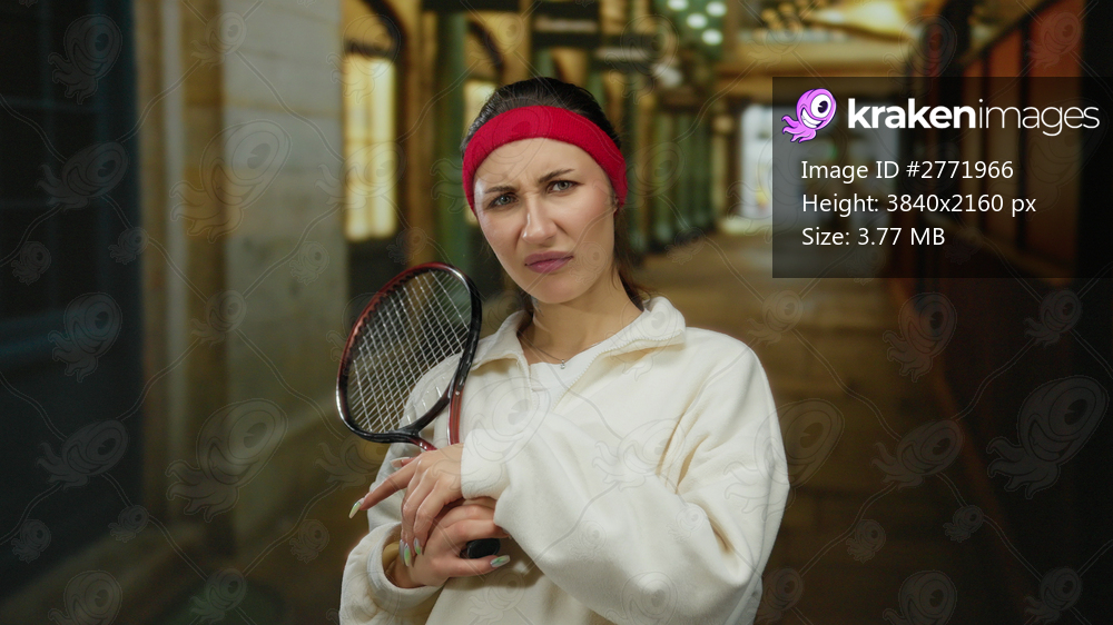 Woman holding tennis racket outdoors on city street wearing a red headband and white jacket with a confused expression suggesting curiosity in urban surroundings. - Kraken Images