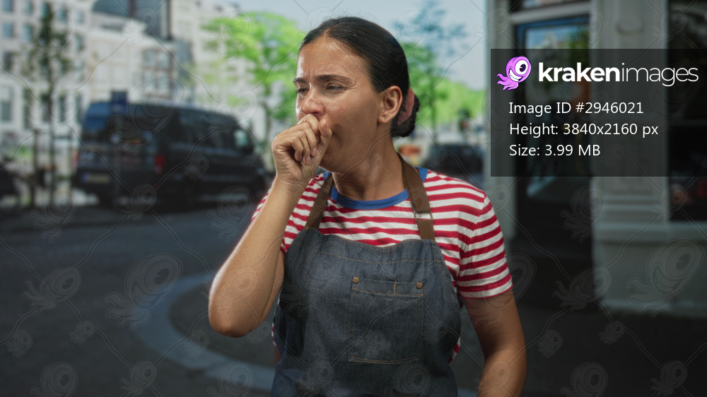 Woman holding throat and coughing on a busy city street near a storefront and van, wearing denim apron and red striped shirt, eyes closed; sick concern. - Kraken Images
