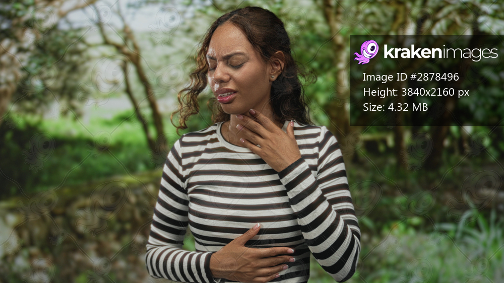 Woman holding throat with one hand and pressing upper abdomen with the other in a green forest park outdoors with breathing difficulty; discomfort.