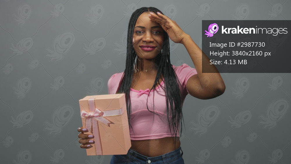 Woman holding tied gift box, hand to forehead shielding eyes and looking sideways in studio wearing pink top and jeans; anticipation discovery.