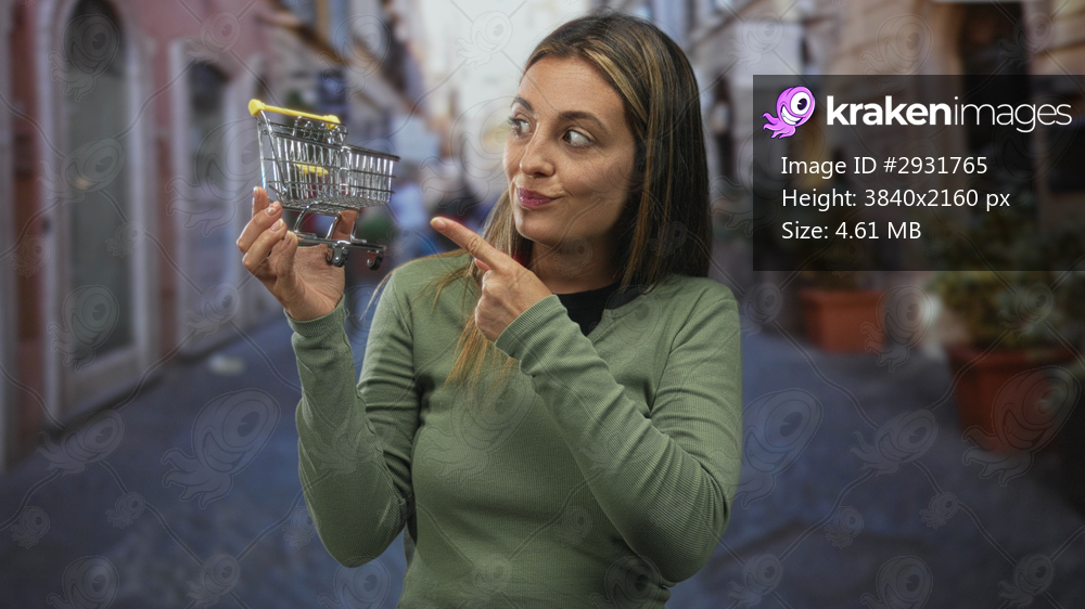 Woman holding tiny shopping cart on city street with hand covering mouth gesture; surprise savings deals.