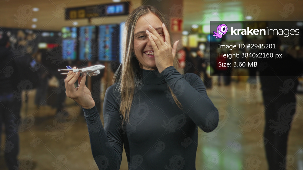 Woman holding toy airplane at airport near departure screens covering face with hand while laughing and smiling; joy wanderlust.