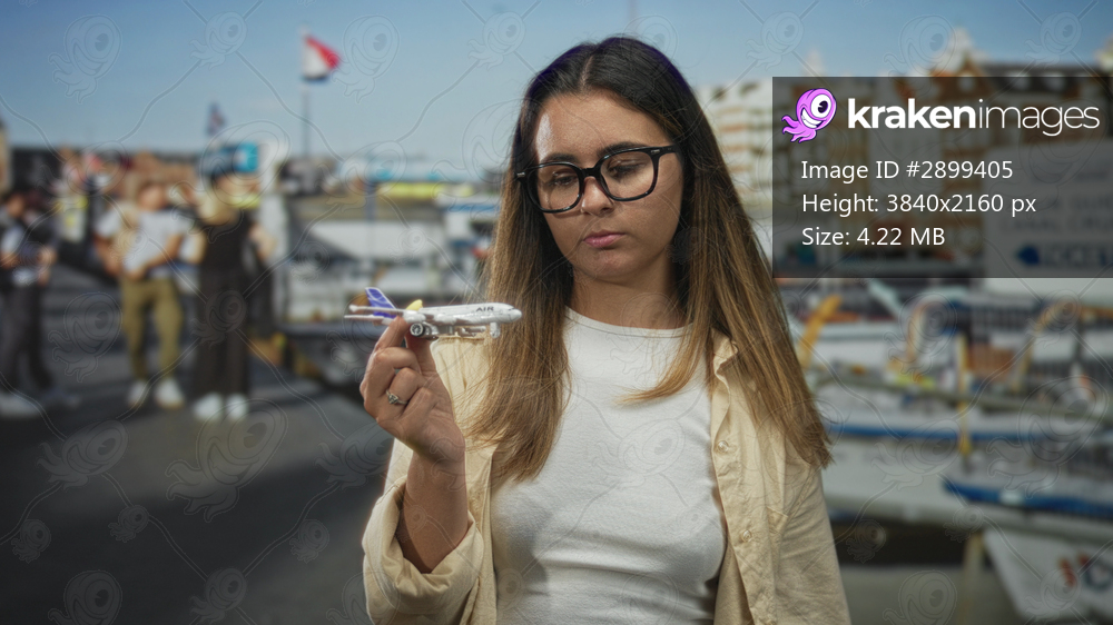 Woman holding toy airplane between fingers at a seaside port with boats in a studio setting; travel longing.