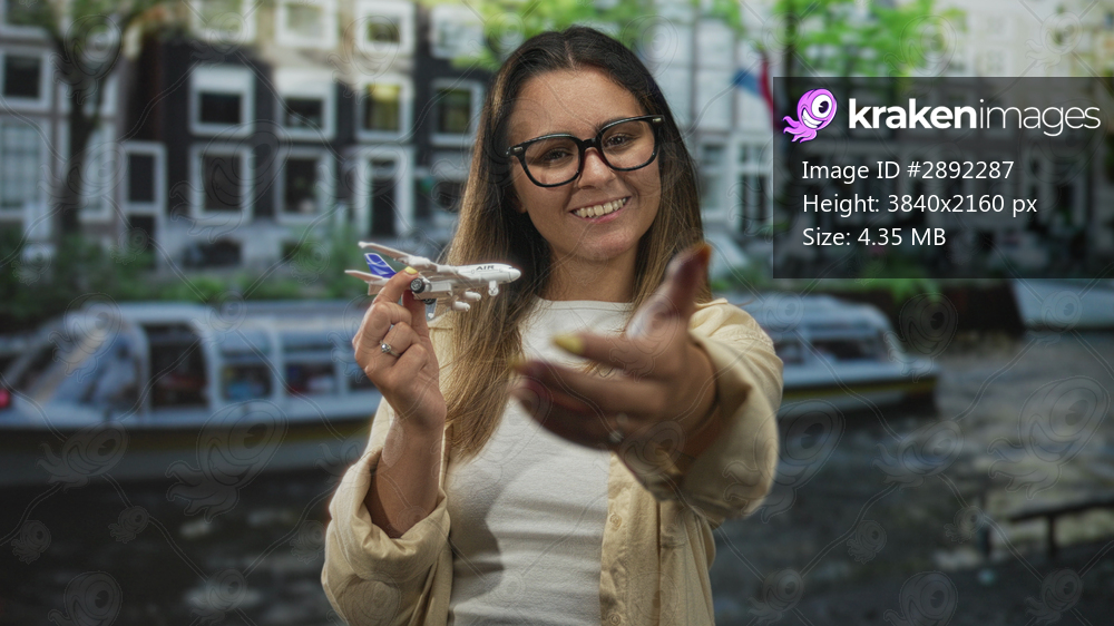 Woman holding toy airplane by hand on amsterdam street beside canal tour boat and row of narrow buildings; wanderlust travel dream aspiration.