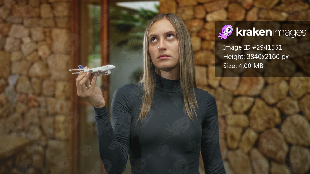 Woman holding toy airplane in one hand with palm up and neutral expression in a stone building interior doorway; contemplation.