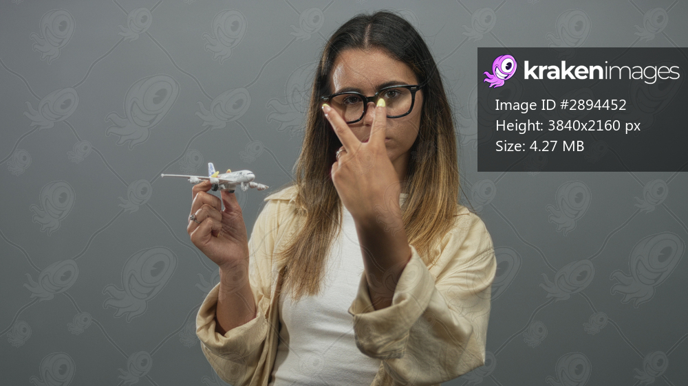 Woman holding toy airplane and pointing finger toward camera in studio with grey backdrop, wearing glasses and casual shirt; determination.
