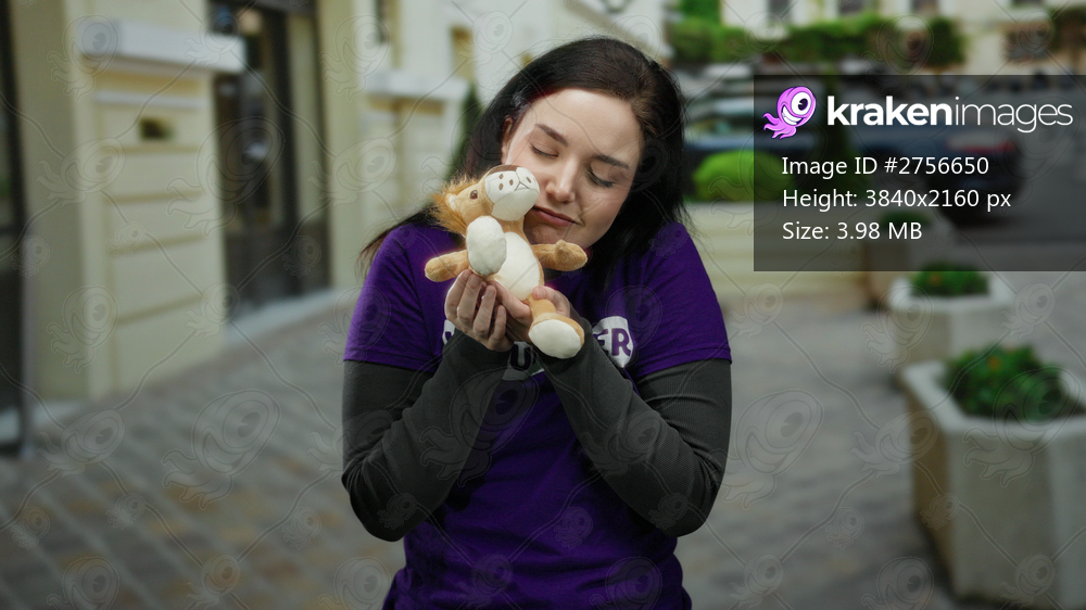 Woman holding toy lion on city street showing volunteer spirit with a soft smile, creating an inviting atmosphere in an urban environment emphasizing community and kindness. - Kraken Images