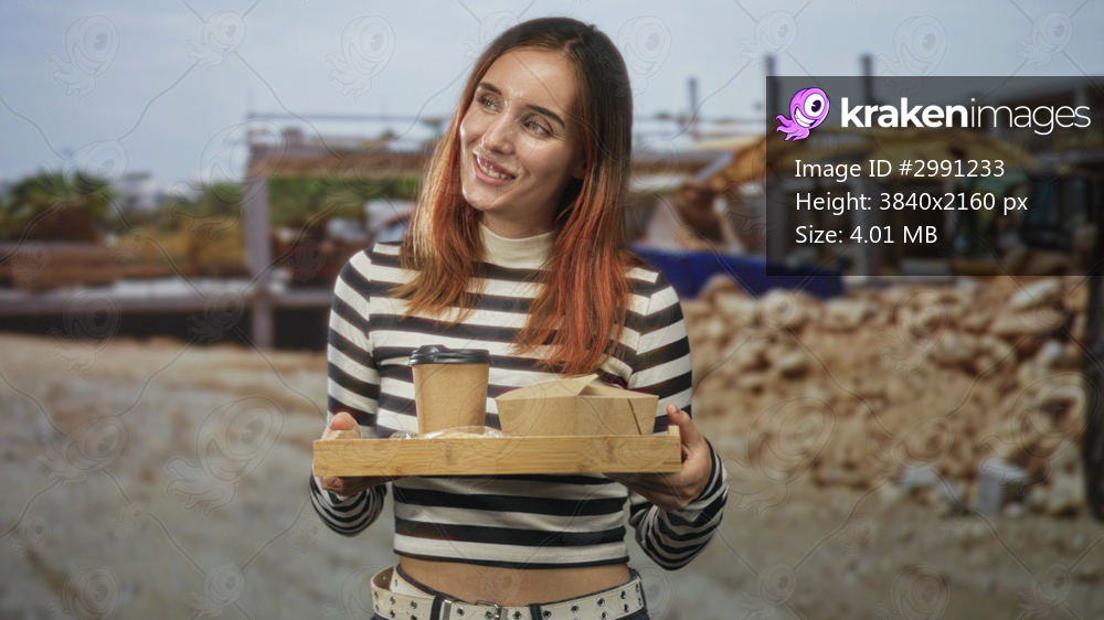 Woman holding tray with coffee cup and takeaway box at construction site, slight smile and head tilt; cheerful break.