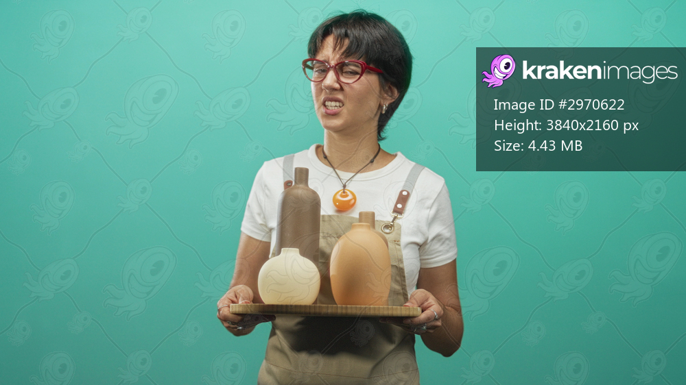 Woman holding tray of pottery vases with hands, grimacing while balancing objects in studio; quiet discomfort.