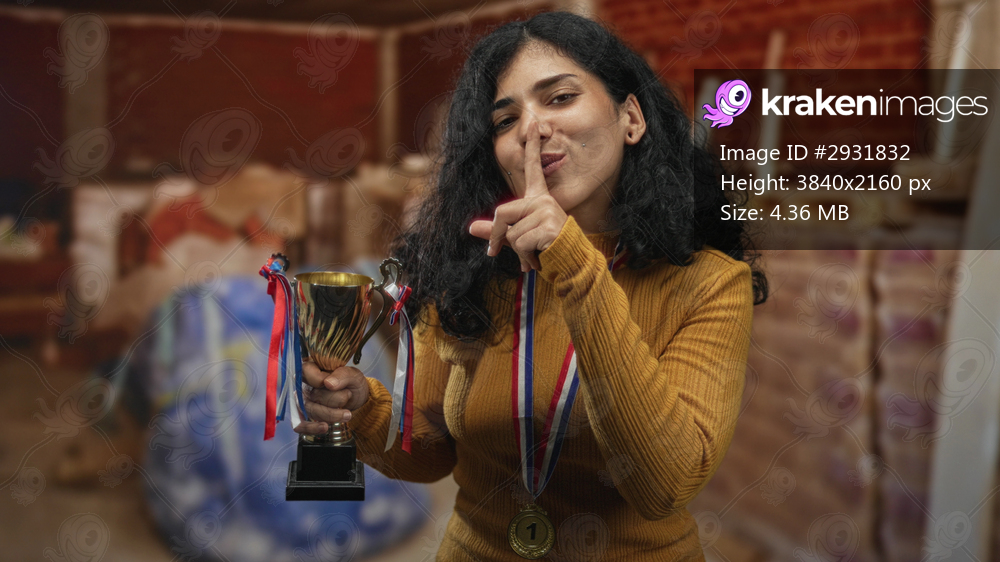Woman holding trophy and finger to lips for silence in building at construction site, wearing gold medal on ribbon and yellow sweater; pride achievement. - Kraken Images