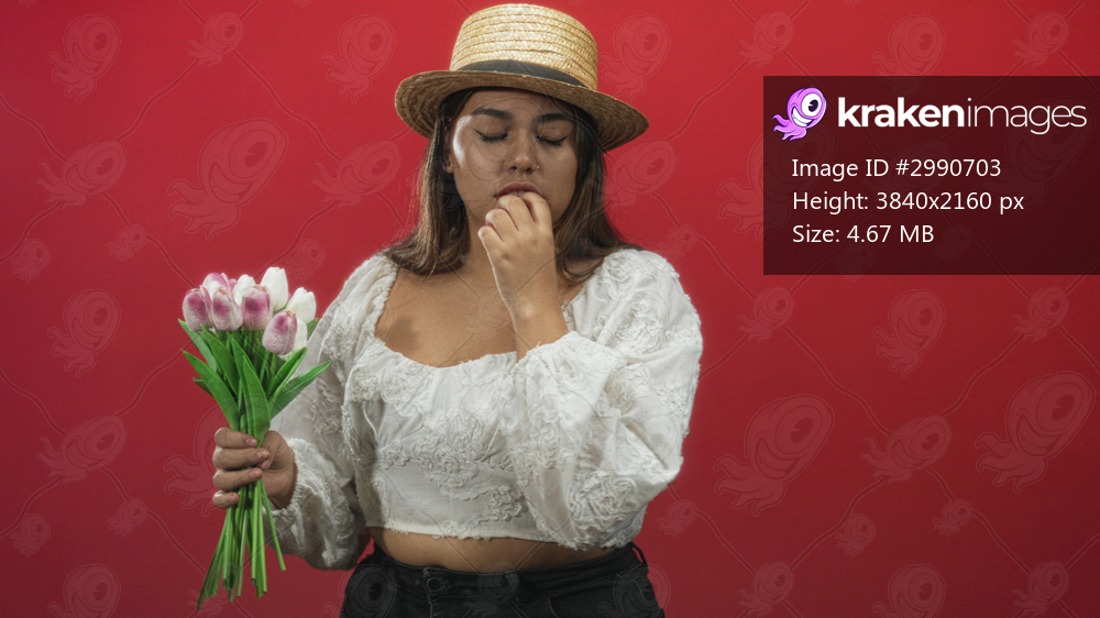 Woman holding tulip bouquet with finger to lips gesture in studio, wearing straw hat and white lace blouse while glancing aside; quiet melancholy.