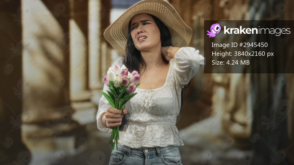 Woman holding tulip bouquet and hand on neck grimacing while wearing sun hat in a stone colonnade building; discomfort nostalgia.