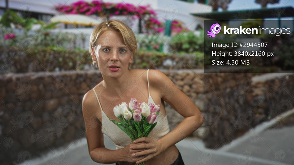 Woman holding tulips shielding eyes on street with stone wall and bougainvillea, wearing camisole and bare midriff; reflection serenity.