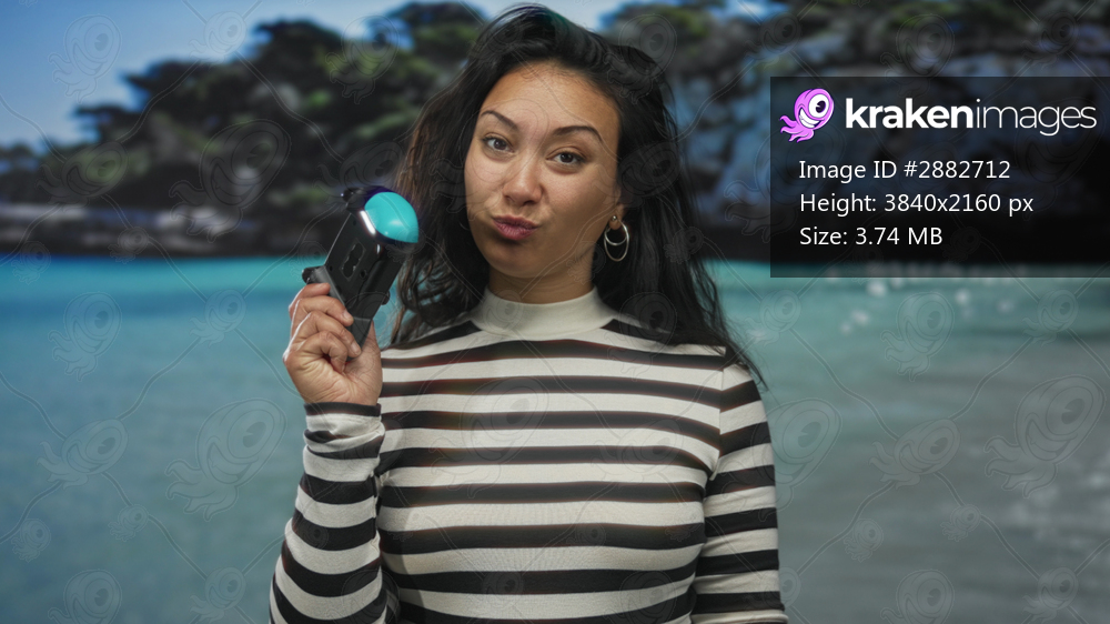 Woman holding turquoise gadget and points finger to device in studio beach set; playful curiosity smile.