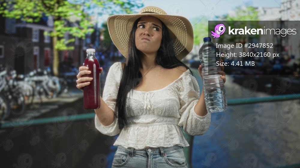 Woman holding two bottles in both hands on a street, comparing a red juice bottle and a clear water bottle while frowning; uncertainty choice.