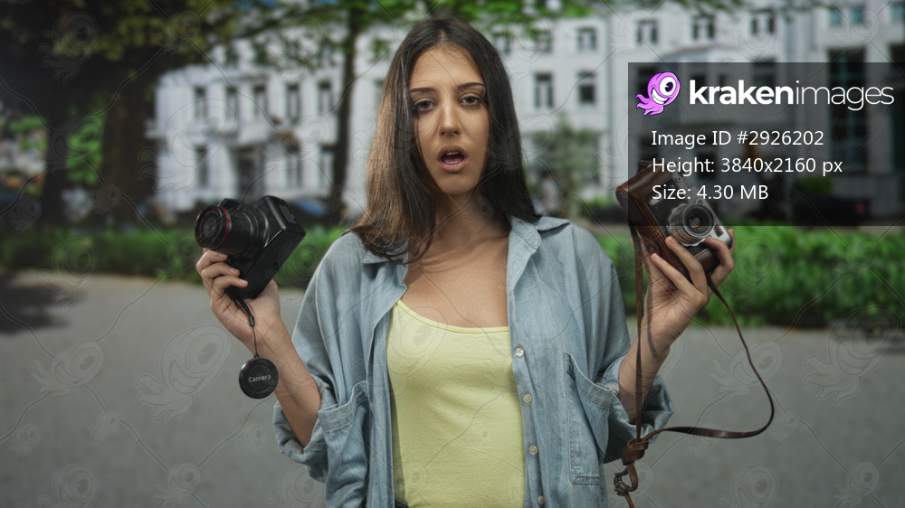 Woman holding two cameras on a city street, frowning while comparing a dslr and a vintage camera; gear indecision confusion.