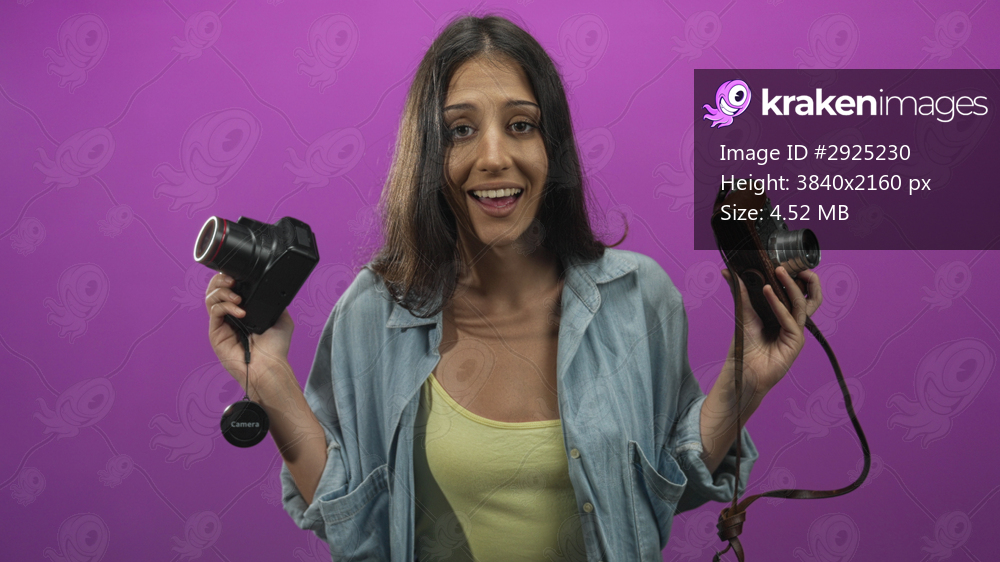 Woman holding two cameras and smiling with raised hands in a purple studio wearing denim shirt and yellow tank top; playful curiosity.