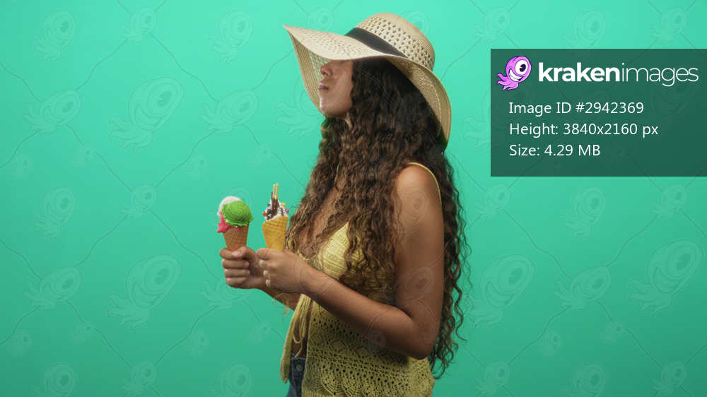 Woman holding two icecream cones, sunhat tilted, yellow crochet top and jeans in studio with green backdrop, neutral steady gaze; summer contemplation. - Kraken Images