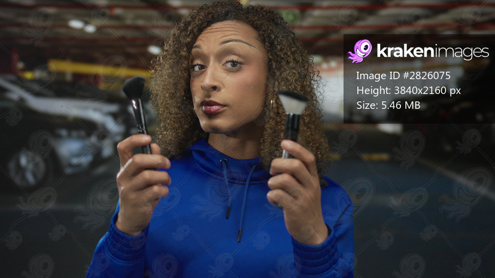 Woman holding two makeup brushes in dimly lit building while comparing tools with raised eyebrow; pondering.