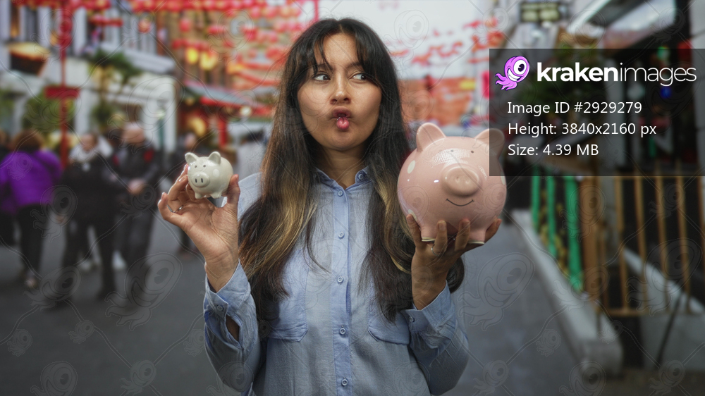 Woman holding two piggy banks, small white and large pink, hands visible, puckering lips on a busy city street; playful budgeting.