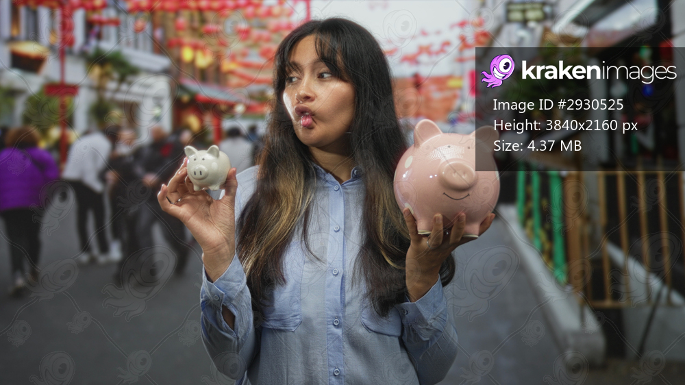Woman holding two piggy banks, small white and large pink, hands visible, puckering lips on a busy city street; playful budgeting.
