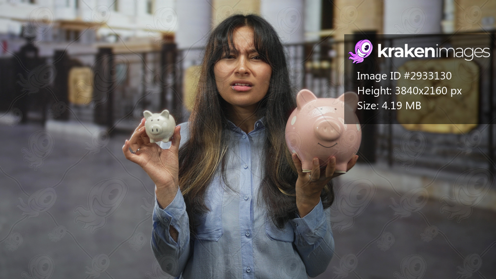 Woman holding two piggybanks and comparing small and large piggybank in a public building; savings dilemma uncertainty.