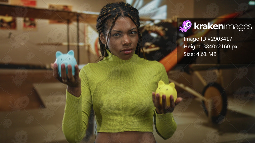 Woman holding two piggybanks in a building with a vintage propeller airplane behind her; saving decision thoughtful.