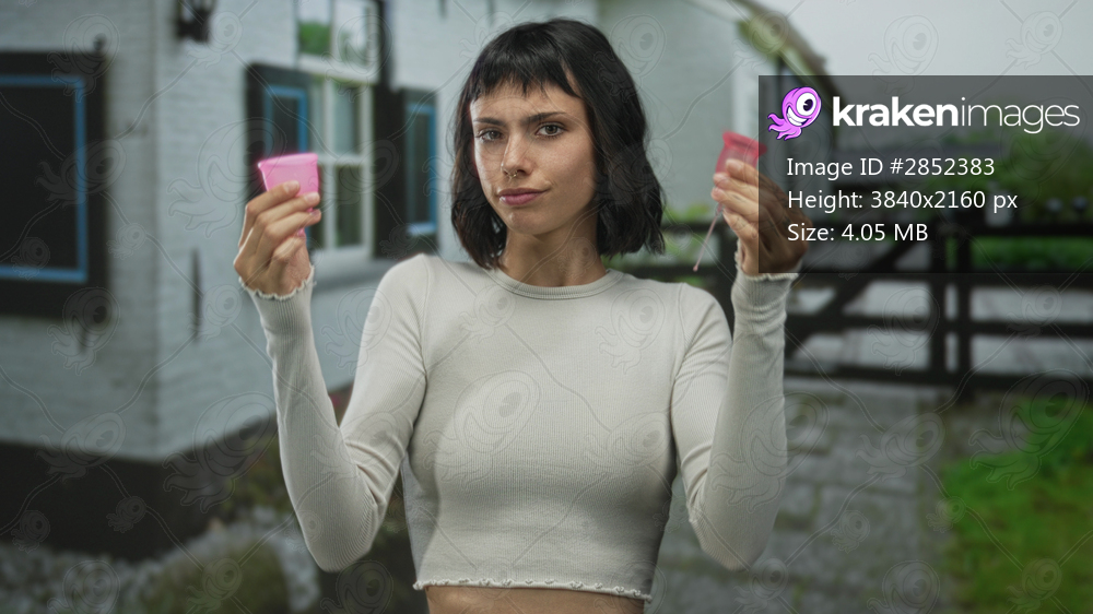 Woman holding two pink menstrual cups comparing them while standing in front of building; sustainable empowerment.