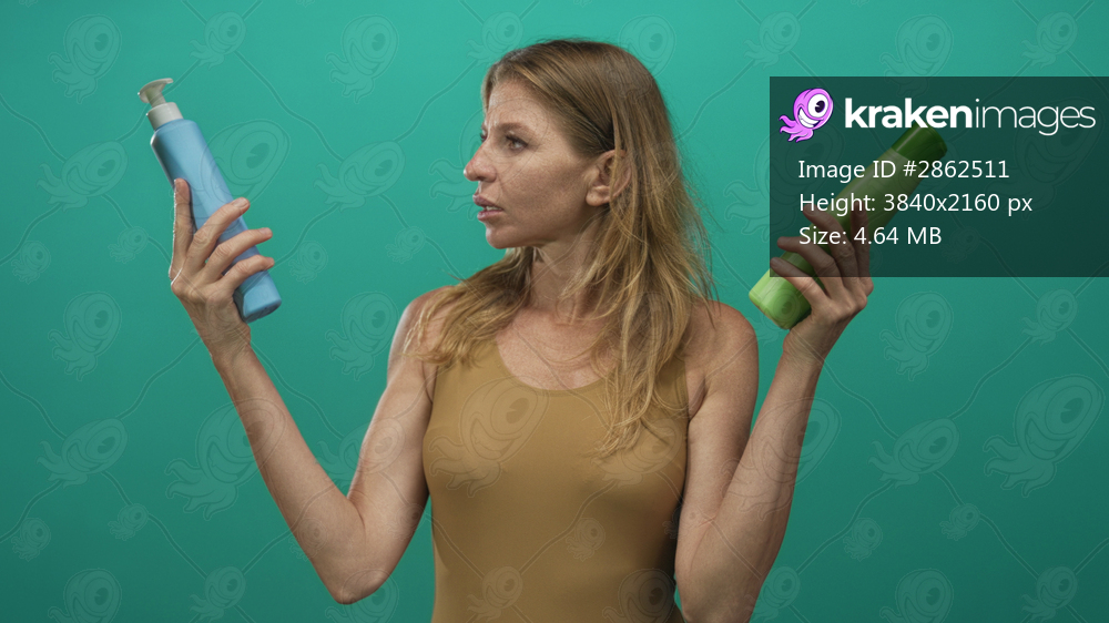Woman holding two plastic bottles with bare arm raised while inspecting one bottle in teal studio; contemplation.