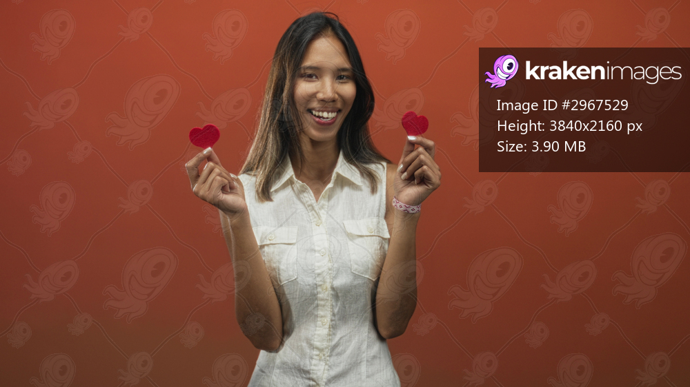 Woman holding two red felt hearts with hands while smiling, wearing white sleeveless shirt in studio orange backdrop; affection warmth.