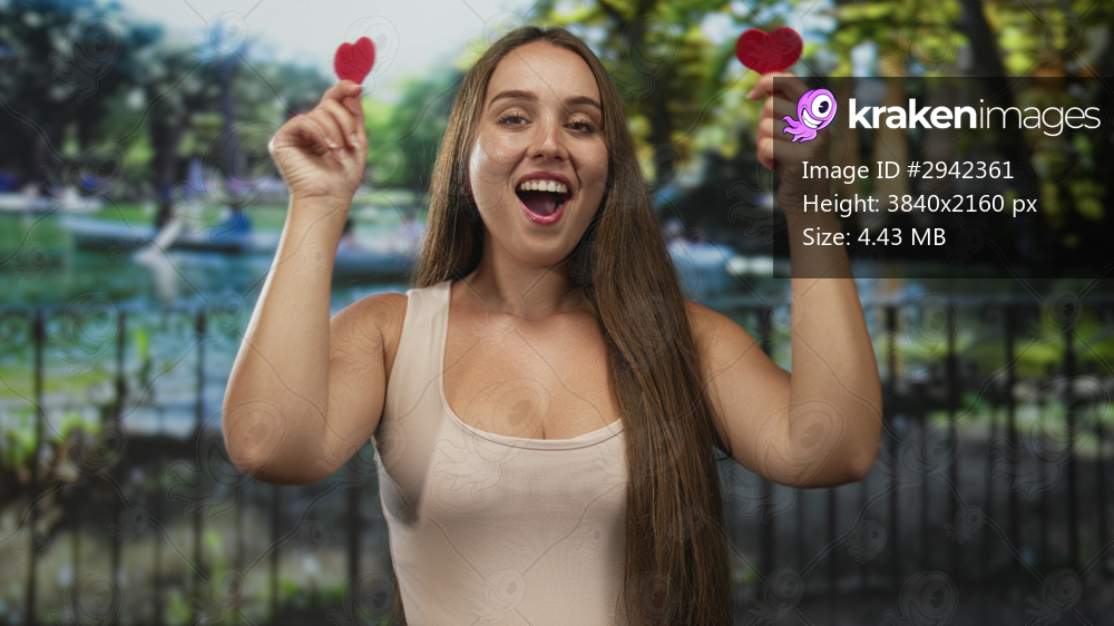 Woman holding two red heart props with raised hands revealing cleavage in park by a lake and iron fence, smiling with open mouth; romance celebration.
