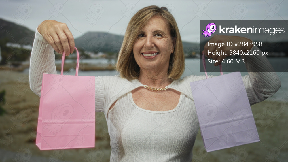 Woman holding two shopping bags with outstretched hands on sandy beach; summer leisure relaxation joy.