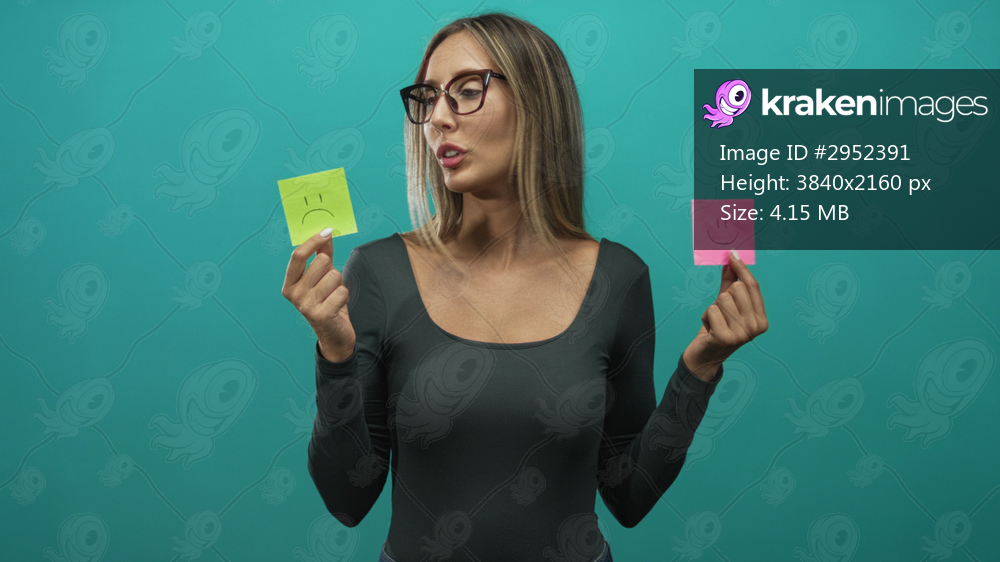 Woman holding two sticky notes showing happy and sad faces in studio with teal wall; choice contemplation.