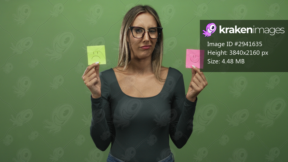 Woman holding two sticky notes with smile and sad faces in studio on green backdrop; indecision choice contrast.