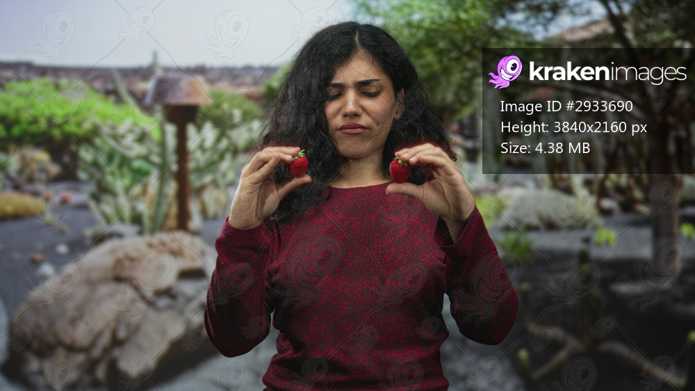 Woman holding two strawberries with closed eyes and wrinkled face in park; taste uncertainty disgust.