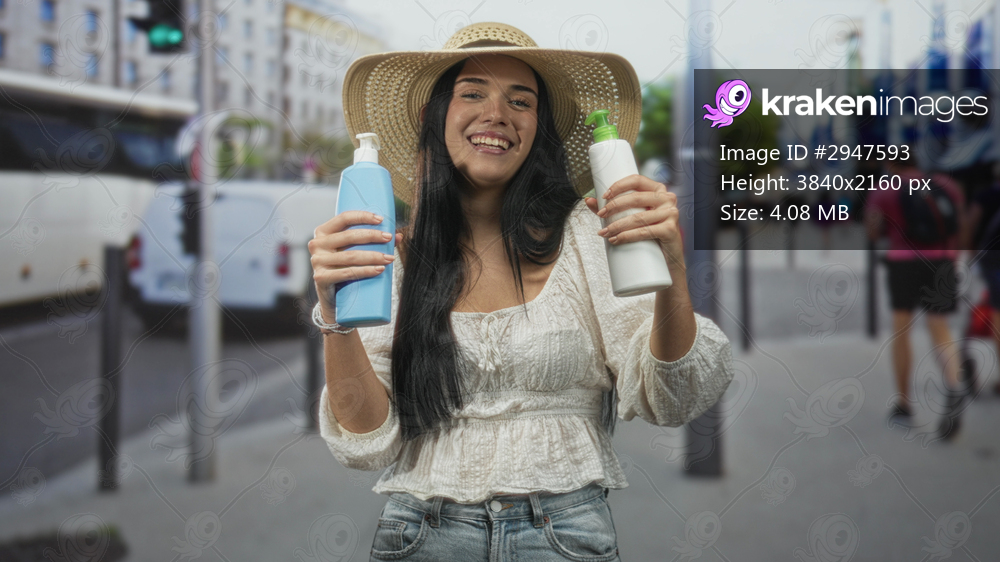 Woman holding two sunscreen bottles with hands visible, smiling and presenting bottles to camera on a busy street; sun protection joy.