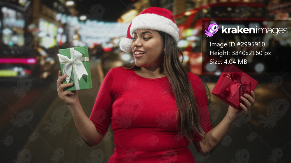 Woman holding two wrapped gifts, green and red boxes, smiling with eyes closed while wearing santa hat on a busy street lit by city lights; festive joy. - Kraken Images