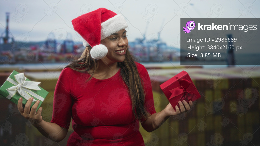 Woman holding two wrapped gifts in hands, wearing santa hat and red dress at a shipping port with containers and cranes, smiling; holiday joy.