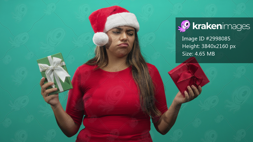 Woman holding two wrapped gifts with pouting face wearing santa hat in studio; disappointment indecision.
