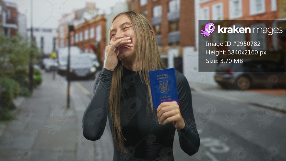 Woman holding ukrainian passport, hand to mouth laughing on street lined with brick buildings and parked cars; joy travel freedom.