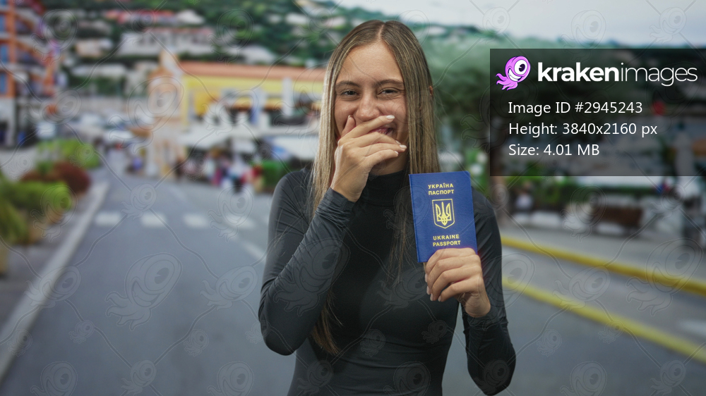 Woman holding ukrainian passport and laughing with hand to mouth on a coastal street; travel hope pride.
