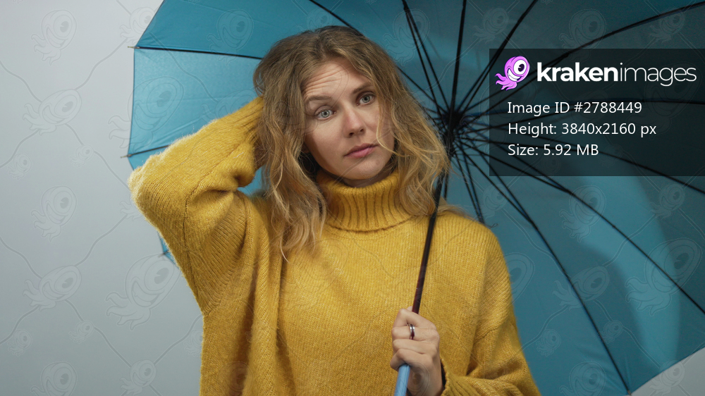 Woman holding umbrella appears confused in indoor studio lighting with a blonde young talent dressed in a yellow sweater stroking her hair.