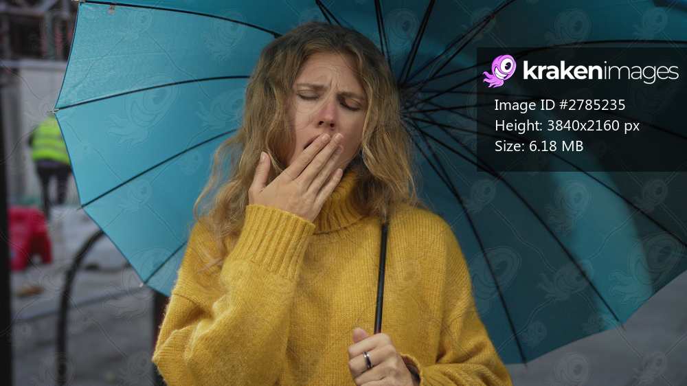 Woman holding umbrella while yawning on street reflects blonde young character in outdoor urban portrait looking tired.