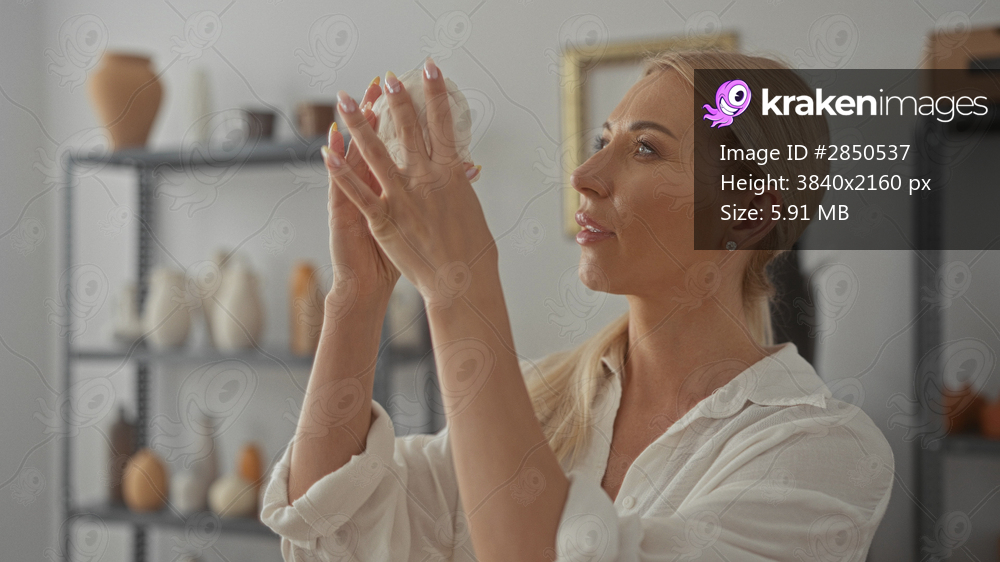 Woman holding unglazed ceramic bowl with both hands in studio as she inspects its texture; contemplation creativity calm artistry.