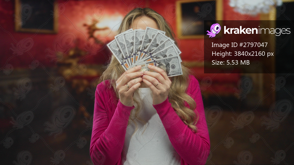 Woman holding united states dollars in a museum, showcasing a casual and confident demeanor in an elegant indoor setting.