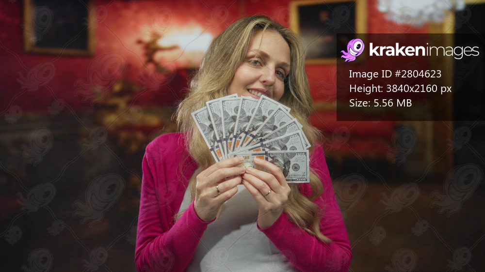Woman holding united states dollars in a museum, showcasing a casual and confident demeanor in an elegant indoor setting.