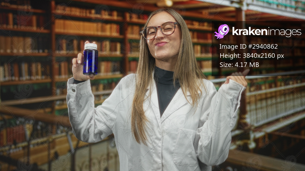 Woman holding up a blue medicine bottle and smiling in a historic library with bookshelves while wearing a white lab coat; confidence discovery.